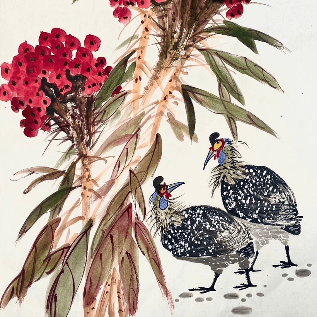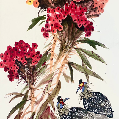 Нарисуем цесарок и скворцов как дополнение к цветам.