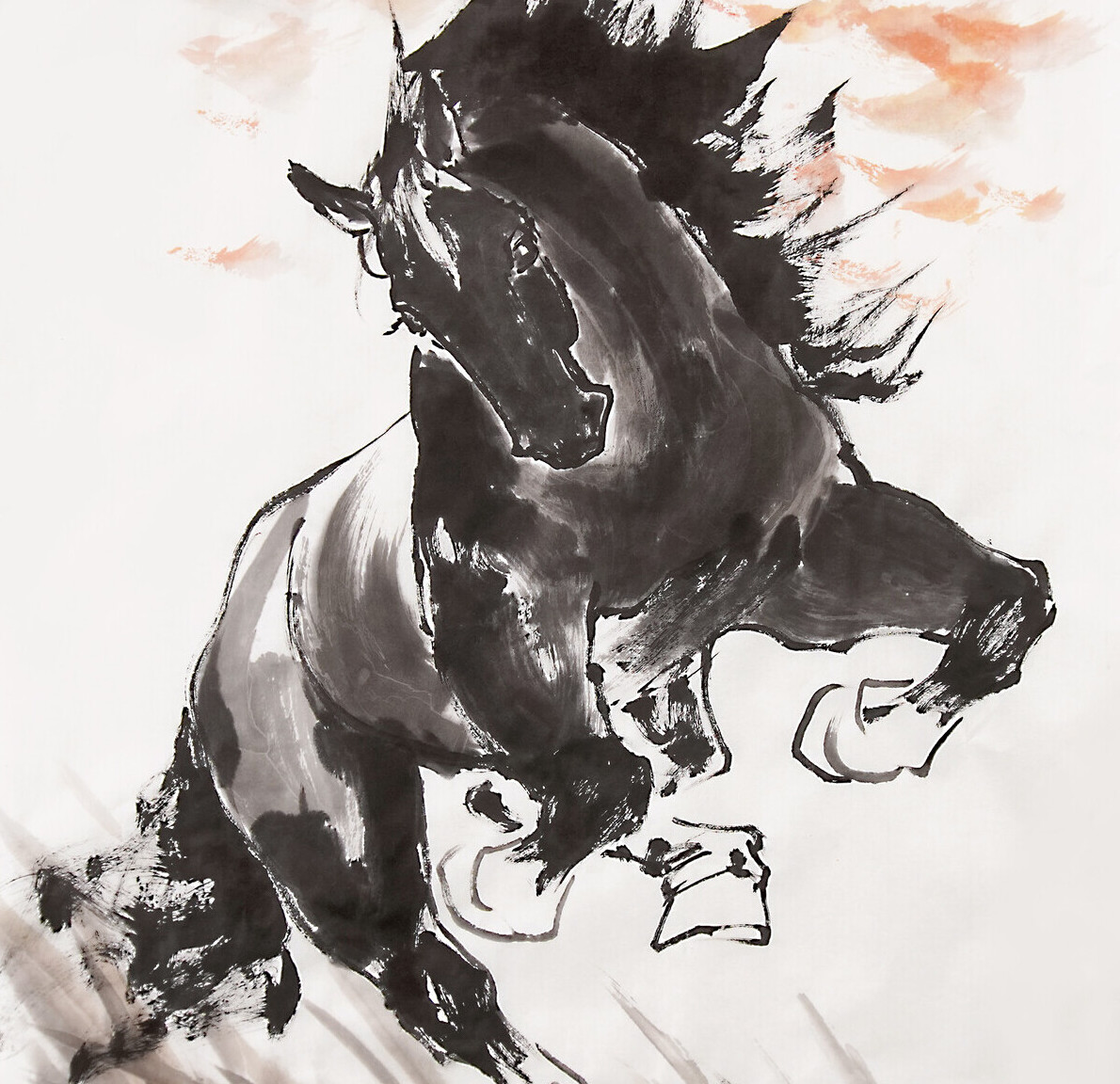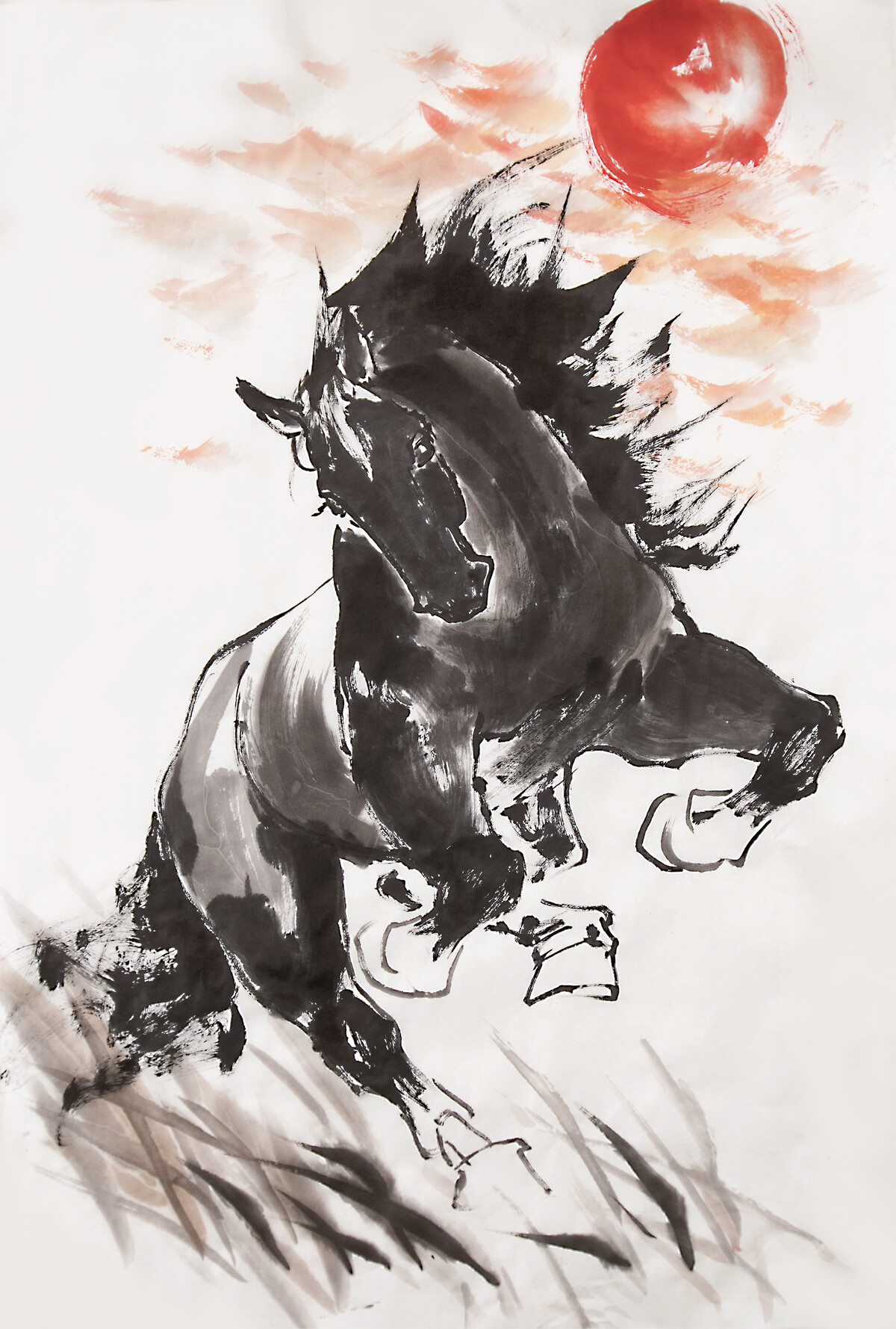 Великолепная лошадь — сила, напор, скорость! Она словно создана для живописи се-и. Недаром с древних времен в образ лошади вкладывали так много. В некоторых случаях образ лошади сливается даже с образом дракона. И не менее почетное место занимает лошадь в зодиакальном круге.