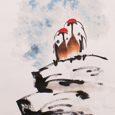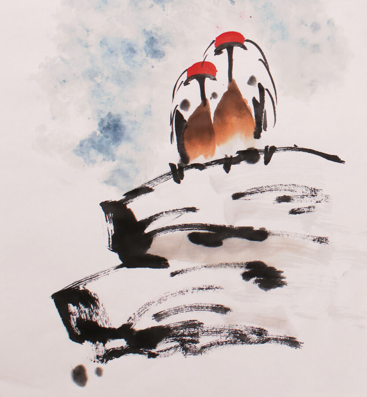 - Выполним несколько композиций тушью и красками, в которых кроме камней будут присутствовать растения, птицы и насекомые.