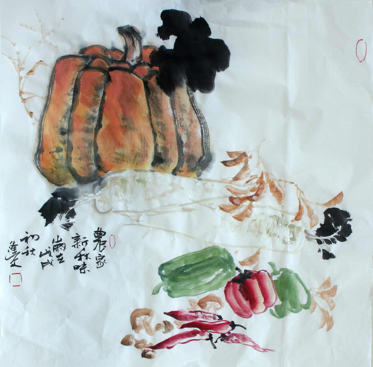 - Рисуем тыквы, перец, капусту, грибы, веточку сливы, ягоды, овощи, вазы.