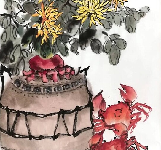 - Нарисуем хризантемы и вино как обязательные атрибуты осеннего китайского застолья.