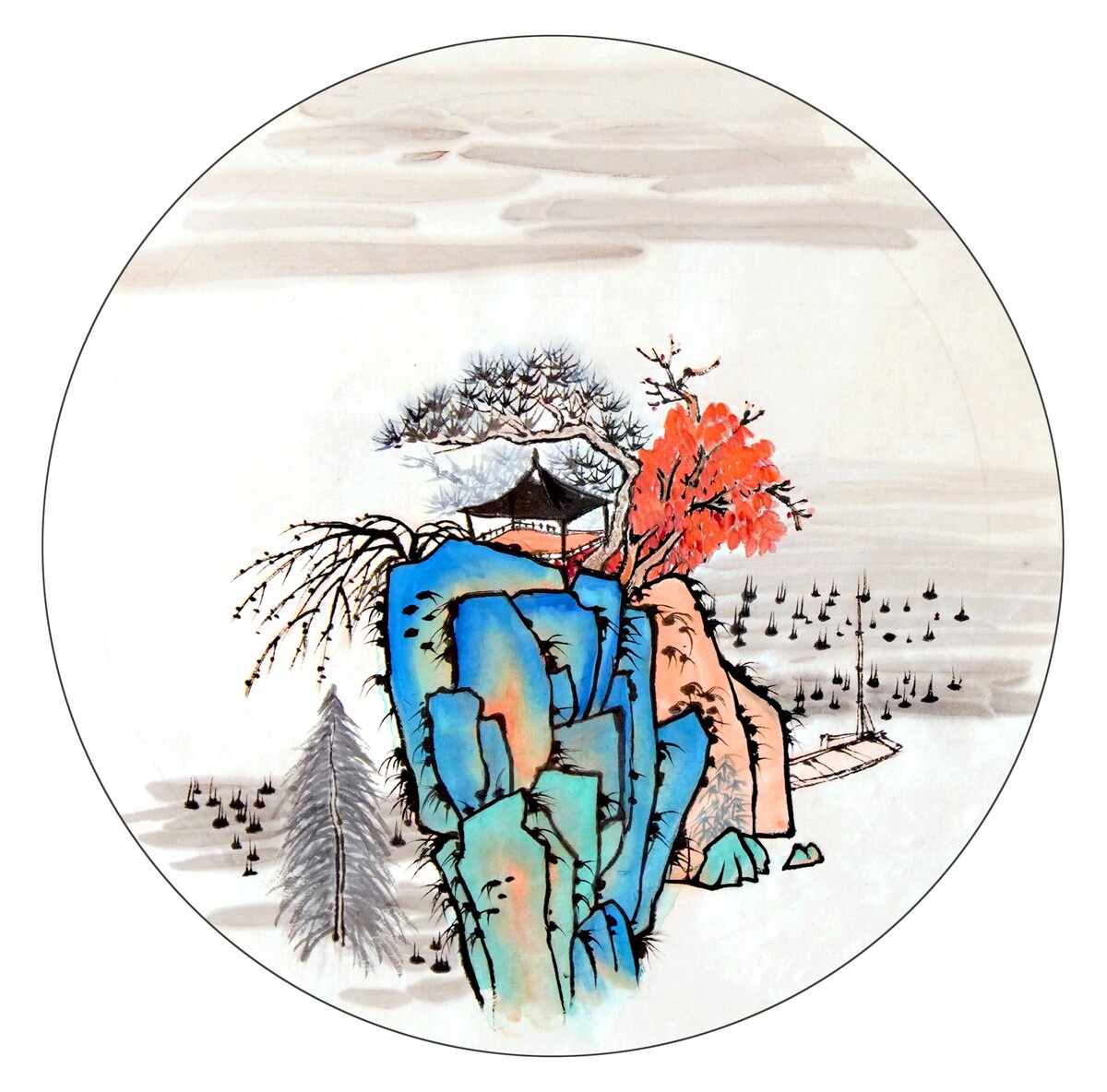 Практика рисования деталей китайского пейзажа: деревья, сосны, лодочки, домики, беседки.