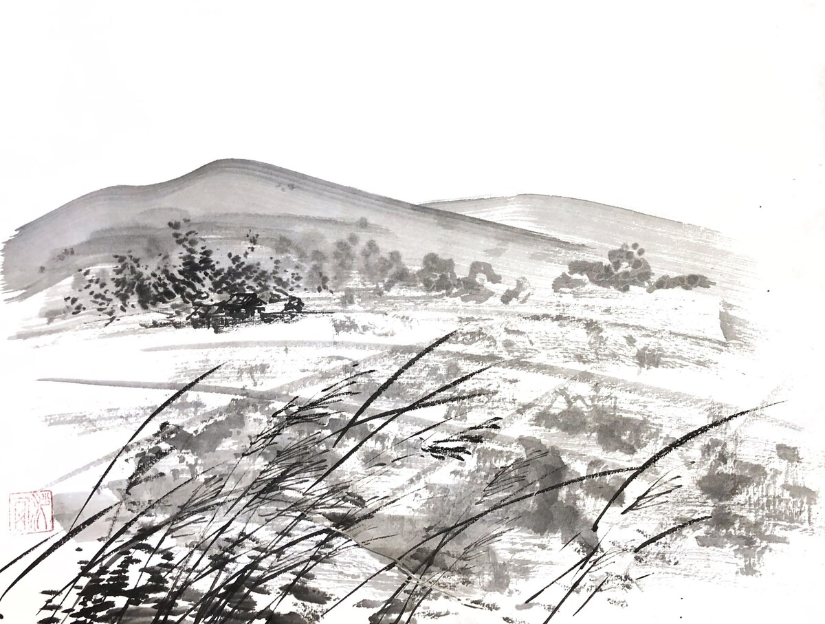 Продолжение изучения приёмов современного японского пейзажа, с помощью которых можно изображать природу и архитектуру в живописи суми-э.