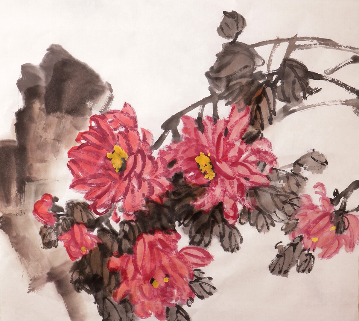 На картинах всегда подчеркивается контраст между ярким цветком и темной зеленью листьев. Изображение хризантемы в прошлом служило символом знатности, счастья и долголетия. Цветок хризантемы символизирует зрелую красоту и целомудрие, возвышенное одиночество и спокойствие, совершенств и изобилие, бодрость духа