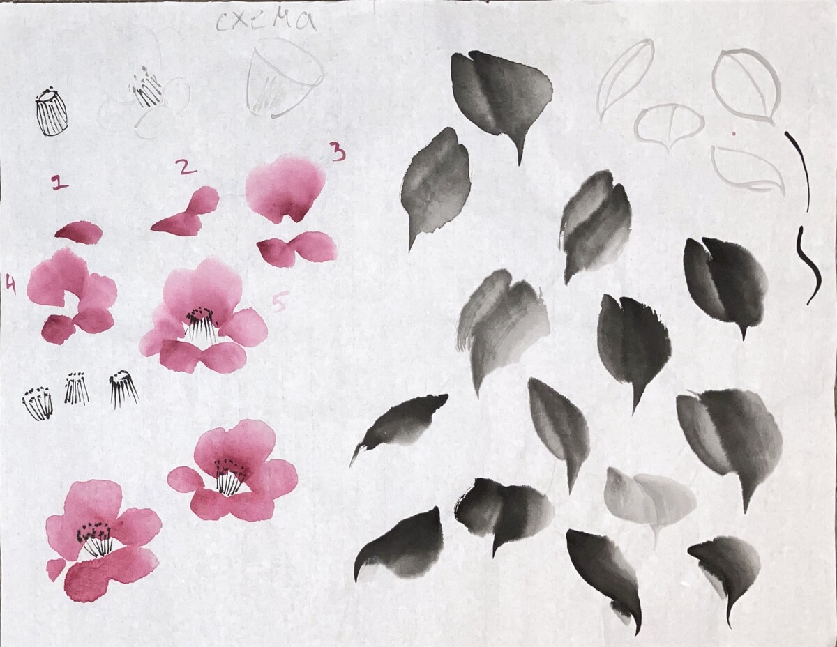 - Самостоятельно выполненные уникальные композиции в стиле японской живописи суми-э