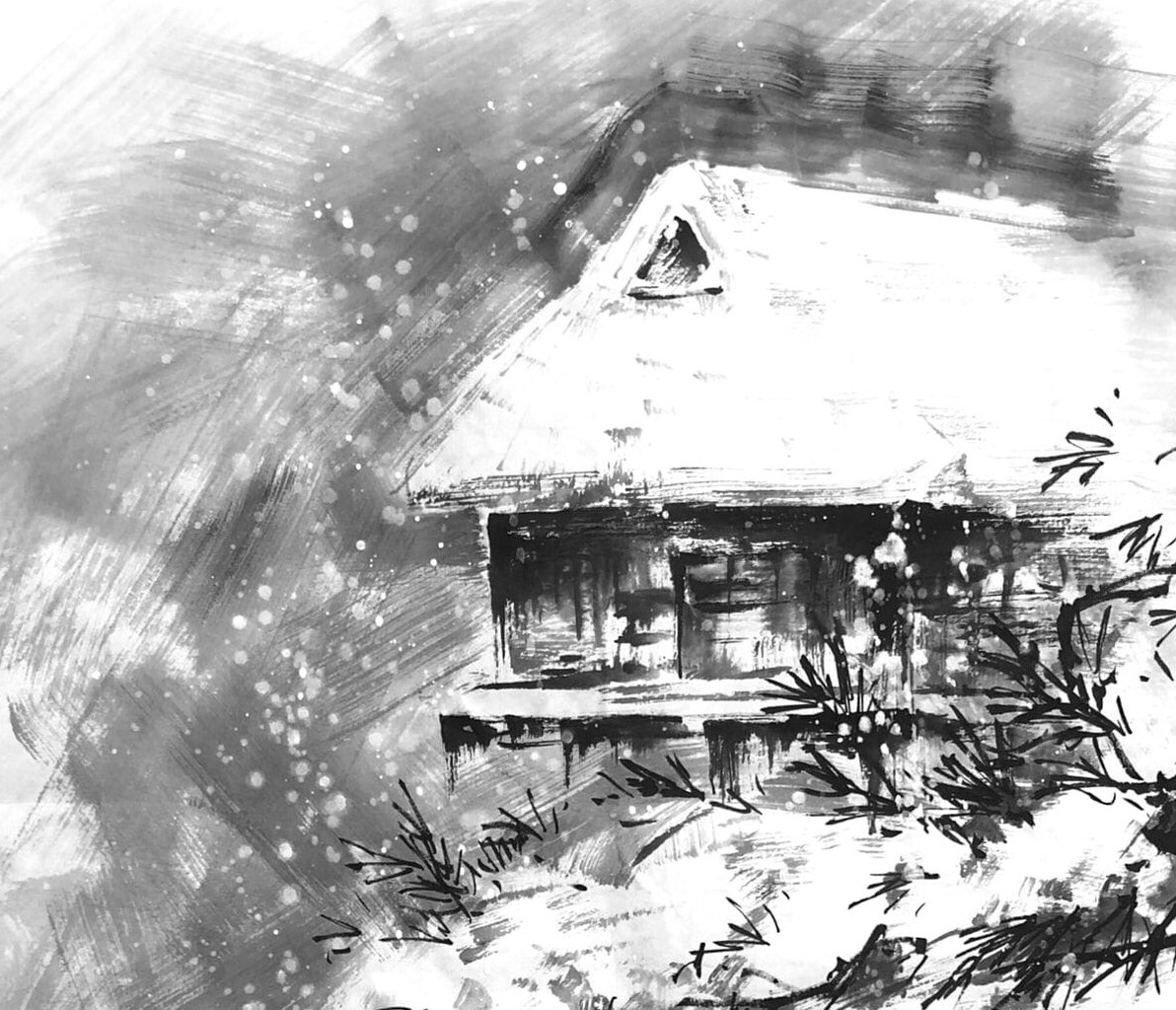 Обучение рисованию заснеженных деревьев, силуэтов гор, деревенского дома и здания храмового комплекса под снегом.